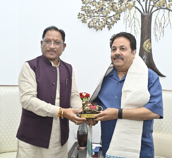 रायपुर। मुख्यमंत्री विष्णु देव साय से मुख्यमंत्री निवास कार्यालय में छत्तीसगढ़ से राज्यसभा सांसद एवं भारतीय क्रिकेट कंट्रोल बोर्ड (बीसीसीआई) के उपाध्यक्ष श्री राजीव शुक्ला ने सौजन्य भेंट की। मुख्यमंत्री श्री साय ने श्री राजीव शुक्ला का कोसा वस्त्र एवं बेल मेटल से निर्मित स्मृति चिन्ह भेंटकर आत्मीय स्वागत किया। इस अवसर पर छत्तीसगढ़ में क्रिकेट सहित अन्य खेलों को बढ़ावा देने से संबंधित विभिन्न महत्वपूर्ण विषयों पर चर्चा हुई।