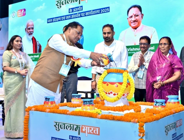 मुख्यमंत्री श्री विष्णु देव साय ने ‘सुजलाम भारत’ के अंतर्गत राजधानी रायपुर स्थित ओमाया गार्डन में जल संरक्षण एवं जल संवर्धन विषय पर आयोजित कार्यशाला को संबोधित करते हुए यह बात कही। इस अवसर पर उन्होंने जल कलश पर जल अर्पित कर जल संचयन का संदेश दिया।