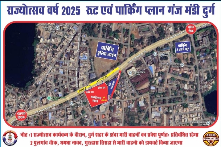 दुर्ग। छत्तीसगढ़ राज्य स्थापना दिवस राज्योत्सव के अवसर पर जिला दुर्ग में व्यापक स्तर पर यातायात एवं पार्किंग व्यवस्था सुनिश्चित की गई है। राज्योत्सव का मुख्य आयोजन स्थल पुराना गंज मंडी, गंजपारा, दुर्ग निर्धारित किया गया है, जहाँ बड़े पैमाने पर नागरिकों, आमंत्रित अतिथियों तथा वीआईपी/वीवीआईपी गणों की उपस्थिति अपेक्षित है। राज्योत्सव के सुचारू आयोजन एवं आगंतुकों की सुविधा को दृष्टिगत रखते हुए दुर्ग यातायात पुलिस द्वारा विस्तृत ट्रैफिक प्लान तैयार किया गया है।