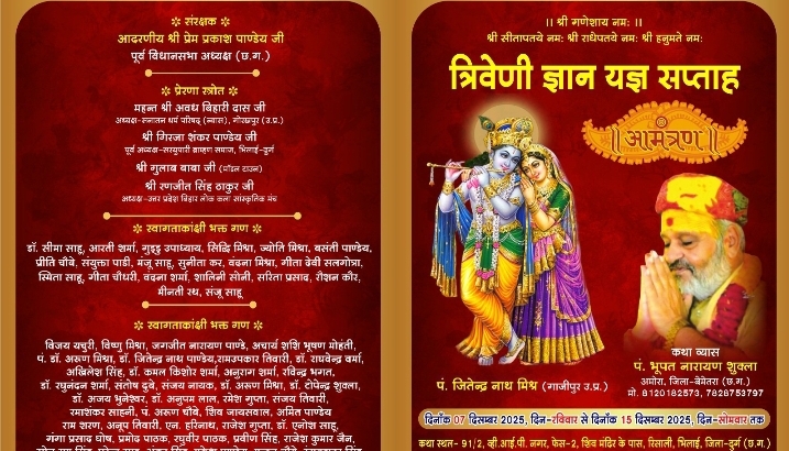 - रिसाली में नौ दिवसीय त्रिवेणी ज्ञान यज्ञ सप्ताह का आयोजन 7 से 15 दिसंबर तक…